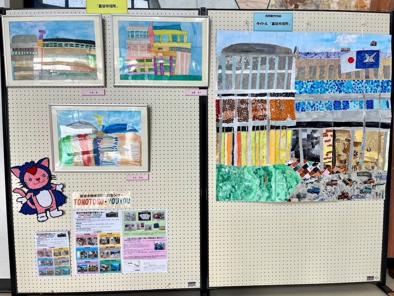 また、昨年度誕生した富谷市社会福祉協議会のマスコットキャラクター「とみゃん」をちぎり絵で表した大作も展示しています。こちらは、利用者の方皆さんで作成しました。